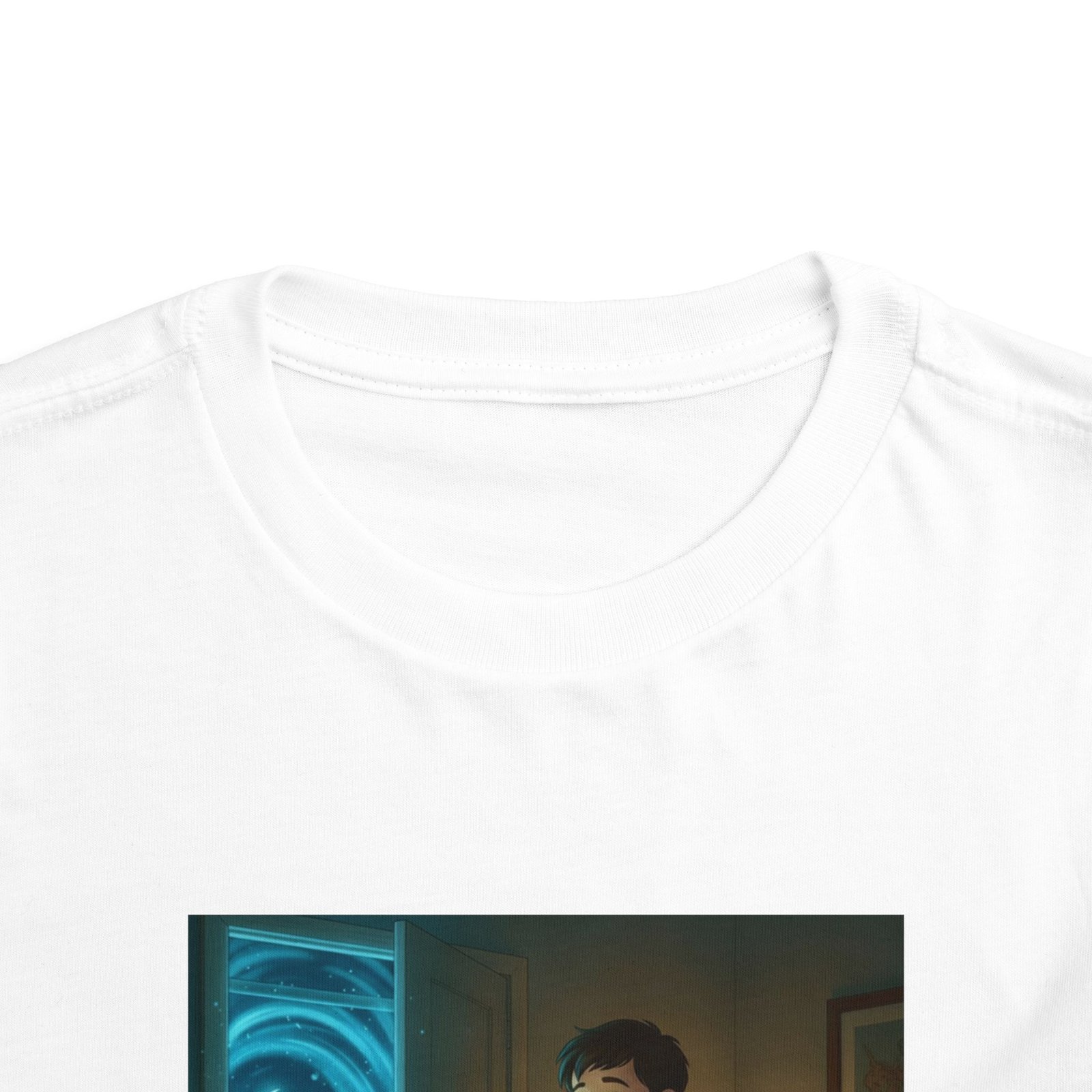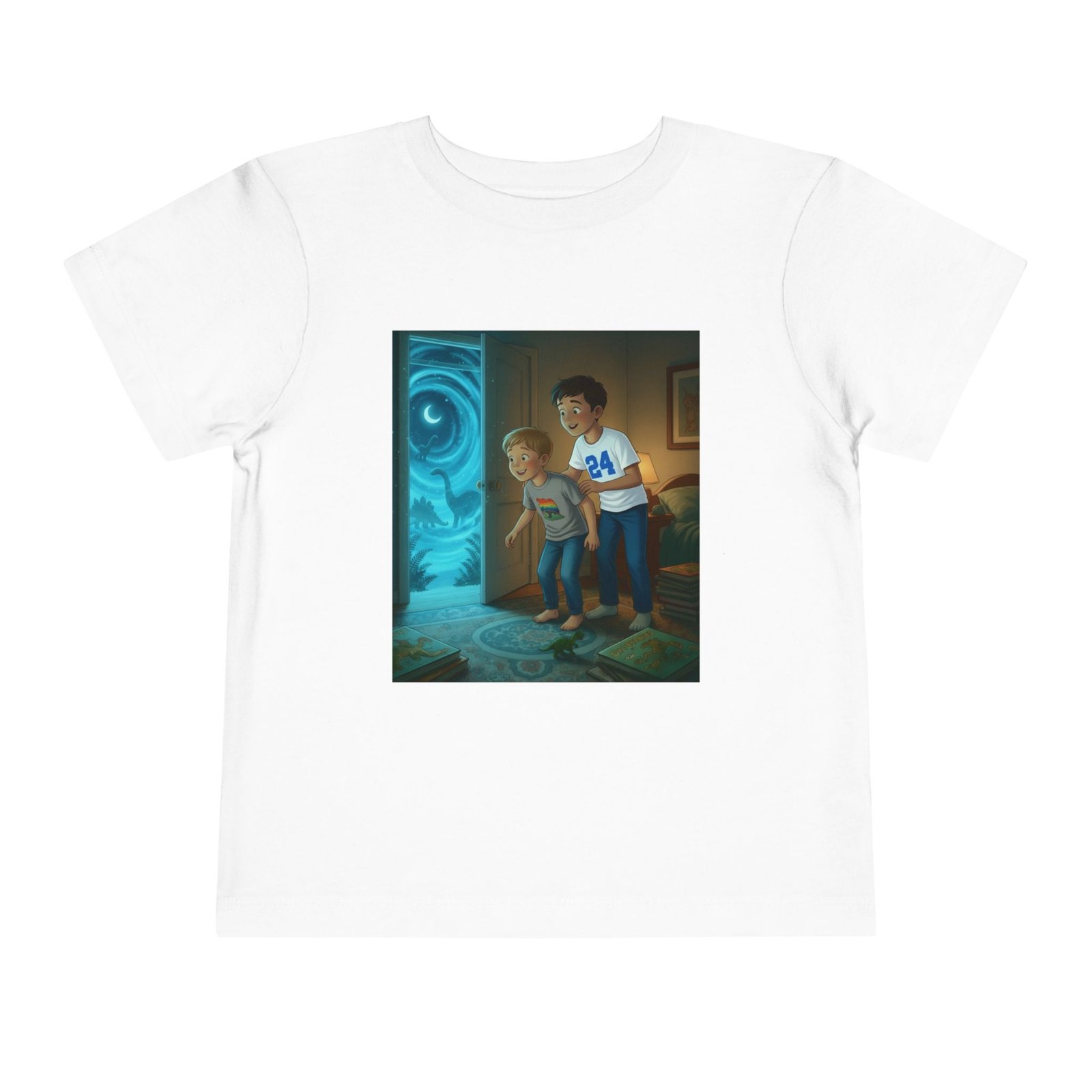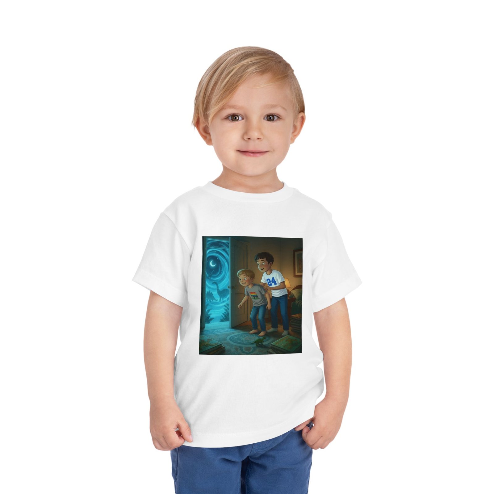 A soft, lightweight toddler tee that brings a little wonder into everyday play. The shirt features a vivid print of two curious kids peering into a shimmering, swirling portal — a scene that sparks imagination at naptime, backyard adventures, or quiet story moments. The fabric feels gentle on sensitive skin and the tear-away label keeps fuss to a minimum. Let this tee be the one your little explorer reaches for when they’re ready to wander into make-believe worlds and quiet bedtime tales.